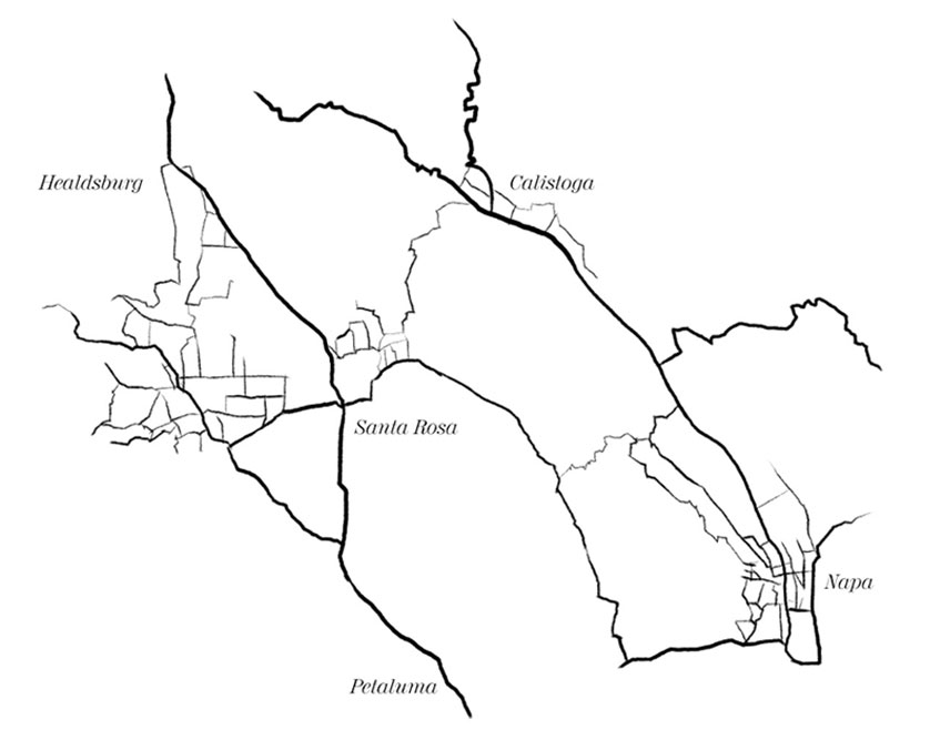 The map to the right shows each of the vineyards chosen by Entrepreneur Wines in Napa and Sonoma counties.